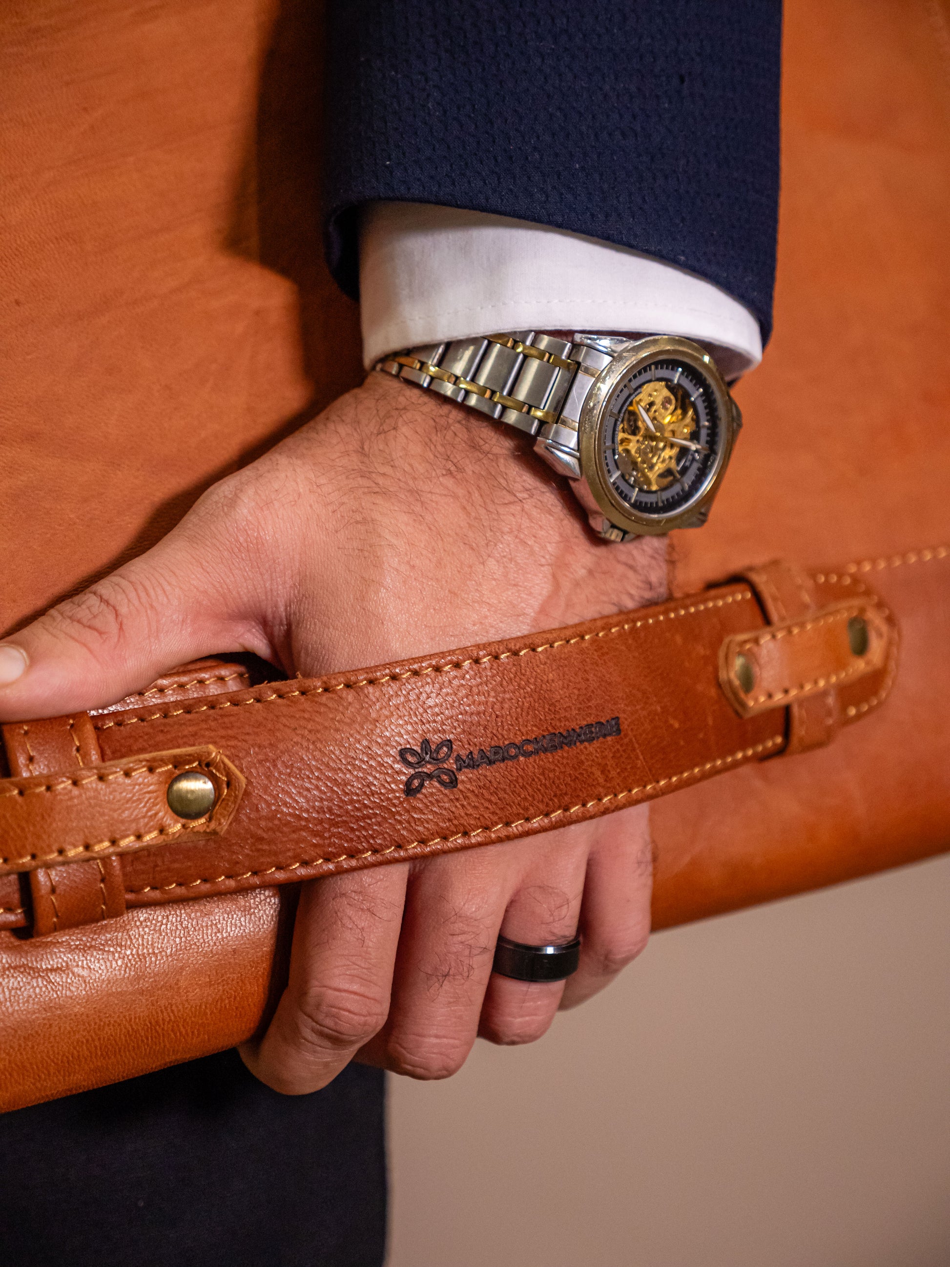 Made from high-quality full-grain leather, tanned using ancestral Moroccan techniques, this cover offers both durability and sophistication. Its soft yet robust texture ensures it withstands years of use while naturally developing a rich patina that makes every piece unique. Impeccable stitching and minimalist detailing reflect the artistry of true craftsmanship, blending traditional values with a sleek, contemporary design.